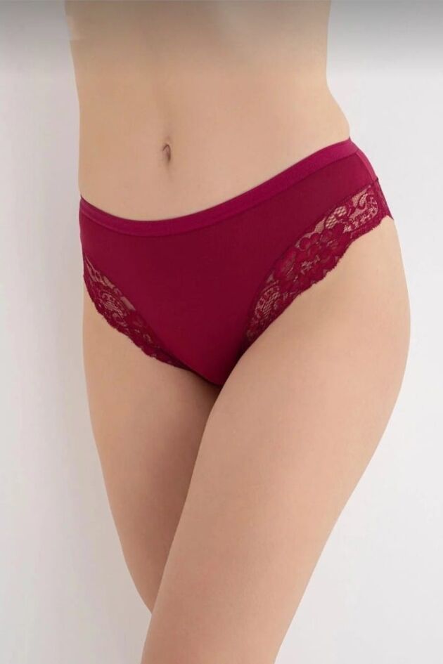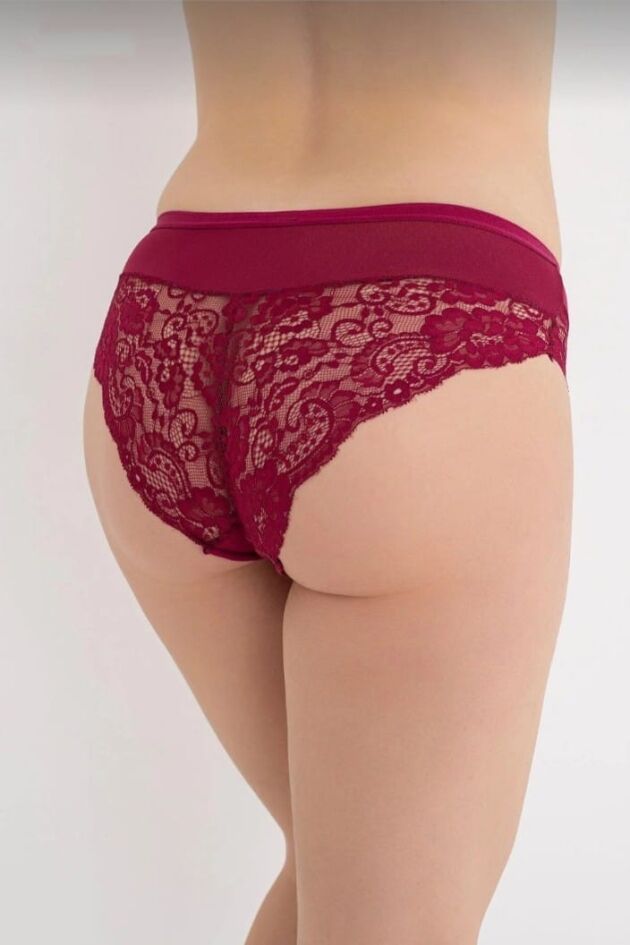 Tasarım Detayları: Ön kısmı sade ve opak kumaştan oluşan modelin arka kısmı tamamen şeffaf çiçek motifli dantel ile kaplıdır. Zengin mürdüm tonuyla dikkat çeker.