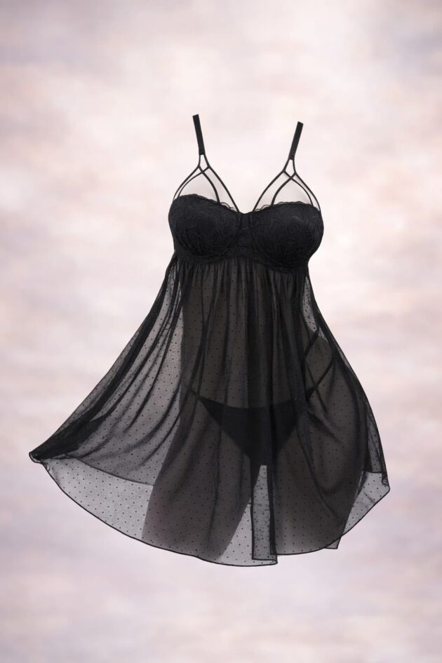 Kumaş Yapısı: Alt kısım, hafif dökümlü ve transparan puantiyeli tül kumaştan üretilmiştir. Bu yapı, vücut hatlarını zarifçe gizlerken estetik bir silüet oluşturur.